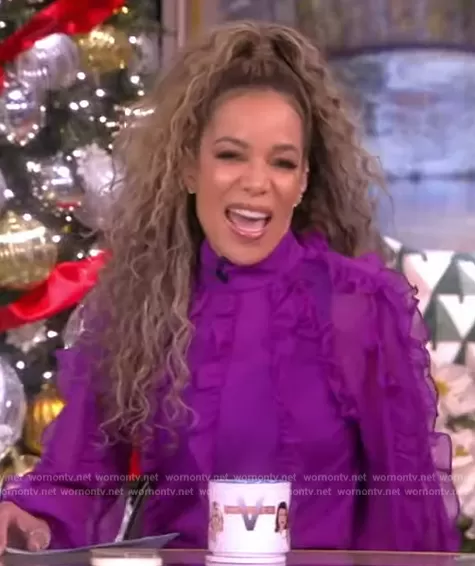 Sunny Hostin on The View on ABC was spotted wearing this purple ruffle blouse on The View on Dec 01 2023's episode. Sunny's Top is the Ruffle High Neck Blouse by Patbo . Sunny's Skirt is the Ruffle Maxi Skirt by Patbo.