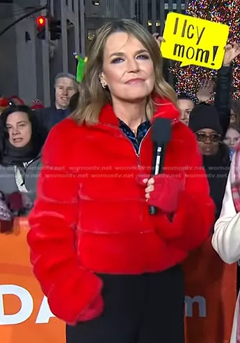 Savannah Guthrie on Today on NBC was spotted wearing this red fur puffer jacket on Today on Dec 16 2025's episode. Savannah's Jacket is the Tala Faux Fur Jacket by Generation Love.