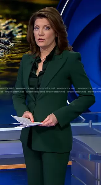 Norah O'Donnell on CBS Evening News on CBS was spotted wearing this dark green shirt and suit on CBS Evening News on Mar 12 2024's episode. Norah's Top is the Hansen Charmeuse Shirt in Forest by Michael Kors Collection . Norah's Jacket is the Georgina Blazer in Forest by Michael Kors Collection . Norah's Pants is the Haylee Pants in Forest by Michael Kors Collection.