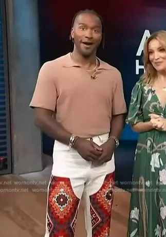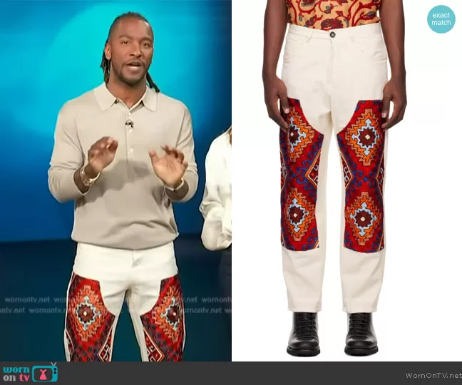 Scott Evans on Access Hollywood on NBC was spotted wearing this white printed jeans on Access Hollywood on May 02 2024's episode. Scott's Pants is the Off-White Double Knee Jeans by Karu Research.