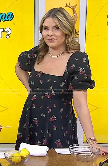 Jenna Bush Hager on Today on NBC was spotted wearing this black floral puff sleeve dress on Today on Dec 01 2023's episode. Jenna's Dress is the The Matilda Dress in Black Ikat Floral Taffeta by Hill House Home.