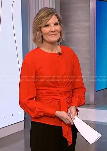 Kate Snow on NBC News Daily on NBC was spotted wearing this red tie waist blouse on NBC News Daily on Dec 02 2023's episode. Kate's Top is the Balloon-Sleeve Crepe Wrap Blouse by Diane von Furstenberg.