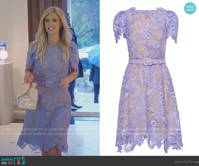 Nicky Hilton Rothschild on Paris in Love on Peacock was spotted wearing this blue lace belted dress on Paris in Love on episode 'Truth and Consequences' (2x04) in Dec 2023. Nicky's Dress is the lace-overlay silk dress by Oscar de la Renta.