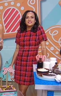 Linsey Davis on Good Morning America on ABC was spotted wearing this red plaid tweed dress on Good Morning America on Dec 04 2023's episode. Linsey's Dress is the Shimmer Houndstooth Tweed Shift Dress in Navy/Pink Multi by Ann Taylor.