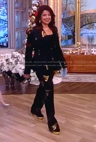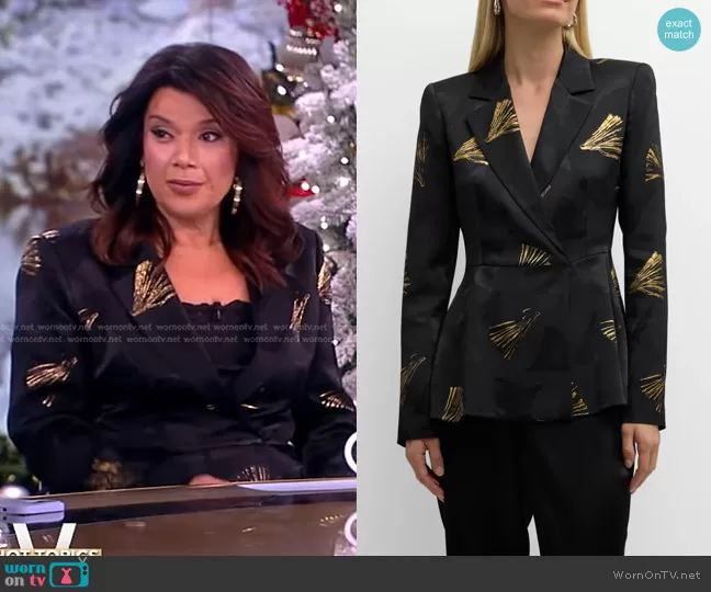 Ana Navarro on The View on ABC was spotted wearing this black and gold blazer and pants on The View on Dec 04 2023's episode. Ana's Jacket is the Metallic Jacquard Peplum Blazer by Lafayette 148 New York . Ana's Pants is the Mid-Rise Straight-Leg Metallic Jacquard Pants by Lafayette 148 New York.