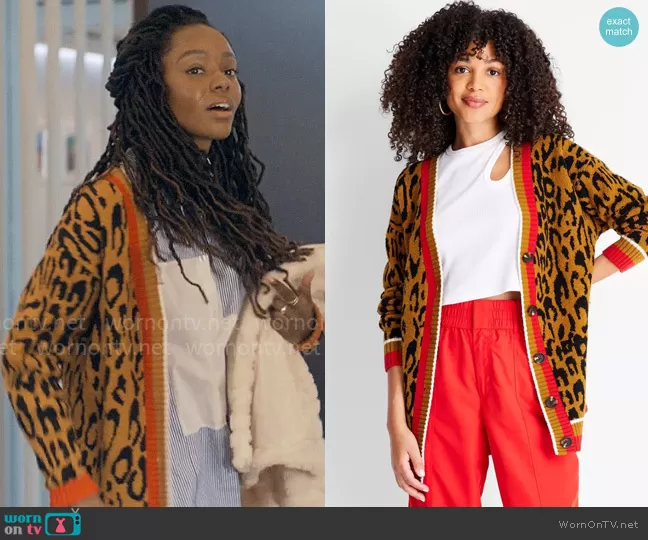 Hazel-May McCall (played by Ashleigh Murray) on The Other Black Girl on Hulu was spotted wearing this leopard print cardigan on The Other Black Girl on episode 'They Say I'm Different' (1x01) in Nov 2023. Hazel's Sweater is the Varsity Cardigan by Future Collective™ with Kahlana Barfield Brown at Target.