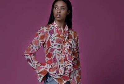 Ginger Zee on Good Morning America on ABC was spotted wearing this white print tie neck blouse and brown pants on Good Morning America on Dec 05 2023's episode. Ginger's Top is the Hamidah Silk Blouse by Sika'a . Ginger's Pants is the Cacey Pleated Front Trousers by Reiss.