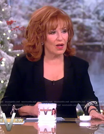 Joy Behar on The View on ABC was spotted wearing this black embellished bow sleeve blazer on The View on Dec 05 2023's episode. Joy's Blazer is the Rhinestone Bow Cuff Blazer by Cinq a Sept.