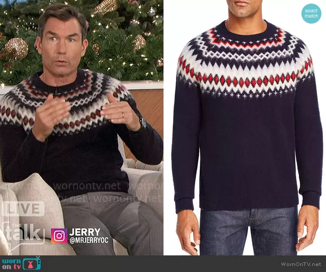 Jerry O'Connell on The Talk on CBS was spotted wearing this navy fair isle sweater on The Talk on Dec 06 2023's episode. Jerry's Sweater is the Merino Wool Fair Isle Sweater by The Men's Store at Bloomingdale's.