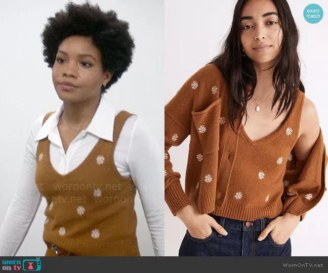 Nella Rogers (played by Sinclair Daniel) on The Other Black Girl on Hulu was spotted wearing this mustard flower embroidered sweater vest on The Other Black Girl on episode 'After the Storm' (1x02) in Nov 2023. Nella's Vest is the Floral-Embroidered V-Neck Sweater Tank by Madewell.