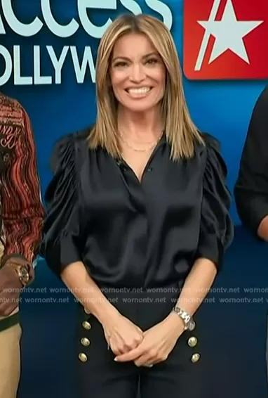 Kit Hoover on Access Hollywood on NBC was spotted wearing this black satin ruched sleeve top on Access Hollywood on Dec 07 2023's episode. Kit's Top is the Gillian Silk Collared Puff-Sleeve Top by Frame . Kit's Pants is the Robertson Trousers by Derek Lam 10 Crosby.