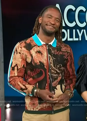 Scott Evans on Access Hollywood on NBC was spotted wearing this abstract print jacket on Access Hollywood on Dec 07 2023's episode. Scott's Jacket is the Brown Cardigan by Ahluwalia and Paul Smith.