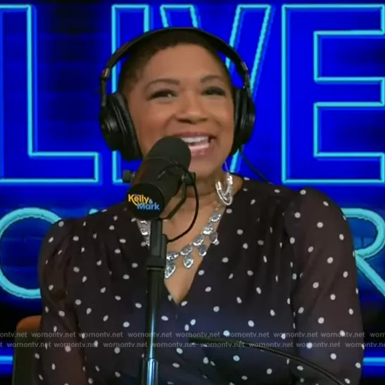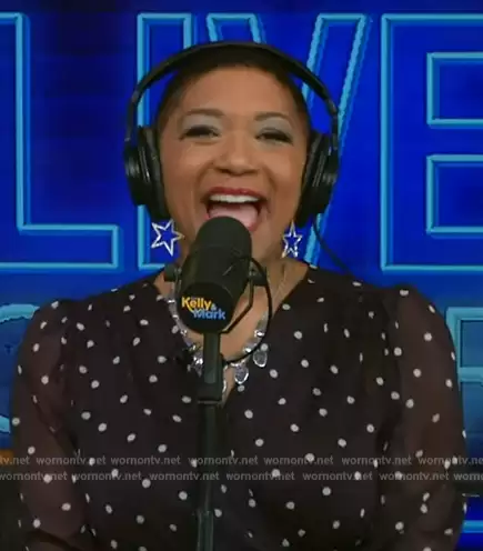 Deja Vu on Live with Kelly and Mark on Disney ABC Home Entertainment was spotted wearing this black polka dot dress on Live with Kelly and Mark on Jun 10 2024's episode. Deja Vu's Dress is the Polka Dot Chiffon Fit & Flare Dress by Tommy Hilfiger.