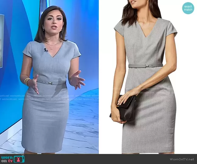 Chloe Melas on Today on NBC was spotted wearing this grey belted dress on Today on Dec 07 2023's episode. Chloe's Dress is the Michahd Belted Sheath Dress by Ted Baker.