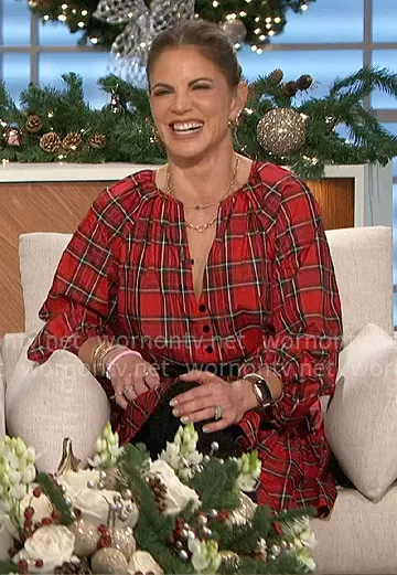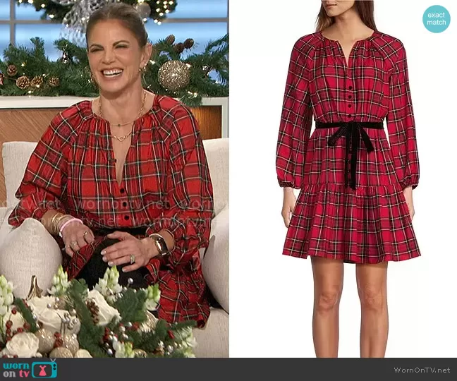 Natalie Morales on The Talk on CBS was spotted wearing this red plaid dress on The Talk on Dec 08 2023's episode. Natalie's Dress is the Karla Plaid Taffeta V-Neck Tie Belt Mini Dress by Antonio Melani.