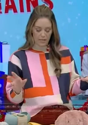 Monica Mangin on Live with Kelly and Mark on Disney ABC Home Entertainment was spotted wearing this colorblock sweater on Live with Kelly and Mark on Dec 08 2023's episode. Monica's Sweater is the The Carys Mock-Neck Sweater by Maeve.