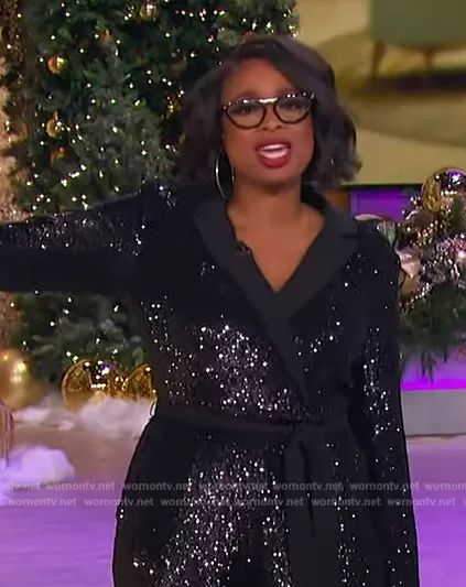 Jennifer Hudson on The Jennifer Hudson Show on FOX was spotted wearing this black sequin blazer jumpsuit on The Jennifer Hudson Show on Dec 10 2023's episode. Jennifer's Jumpsuit is the Sequin Long Sleeve Tie Waist Blazer Jumpsuit by Express.
