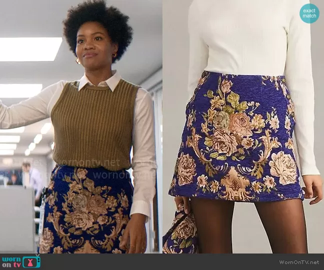 Nella Rogers (played by Sinclair Daniel) on The Other Black Girl on Hulu was spotted wearing this blue floral skirt on The Other Black Girl on episode 'Fake Smile' (1x06) in Nov 2023. Nella's Skirt is the Print Brocade Mini Skirt by Maeve at Anthropologie.