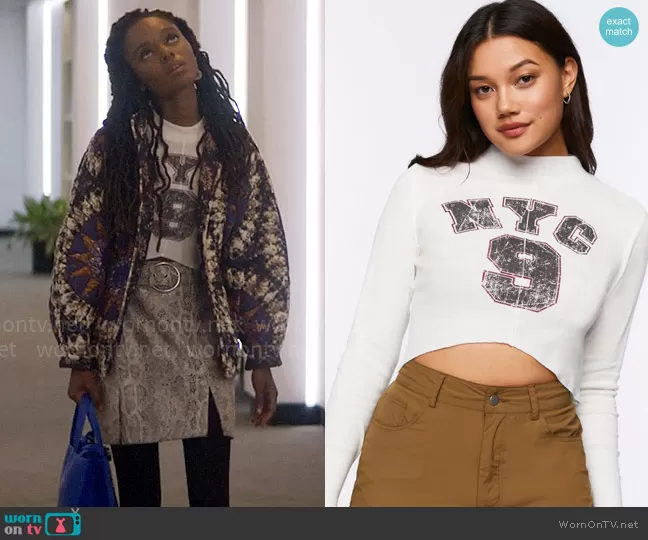 Hazel-May McCall (played by Ashleigh Murray) on The Other Black Girl on Hulu was spotted wearing this printed quilted jacket with grey snake print skirt and NYC crop top on The Other Black Girl on episode 'Fake Smile' (1x06) in Nov 2023. Hazel's Top is the NYC Graphic Baby Tee by Forever 21 . Hazel's Jacket is the Paige Jacket in Orion by Ulla Johnson . Hazel's Skirt is the Snake Printed Belted Mini Skirt by Topshop . Hazel's Bag is the Medium Shopper by Telfar.