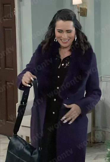 Lois's choice of the wool blend belted coat by MICHAEL Michael Kors for her appearances in GH perfectly encapsulates her persona that doesn't shy away from overt glamour. The coat's rich jewel purple hue exudes a sense of luxury, while the faux fur collar adds an extra layer of sophistication and drama. This coat is more than just a winter garment; it's a fashion statement that reflects Lois's bold and confident style. The combination of the lush color and the plush texture of the fur makes the coat a standout piece, ideal for a character who embraces glamour in every aspect of her life. Lois's ability to carry such a statement-making coat with ease and elegance is indicative of her character's flair for the dramatic and her unapologetic approach to fashion. In the world of soap operas, where fashion often plays a key role in defining characters, Lois's purple fur collar coat by MICHAEL Michael Kors stands out as a symbol of her luxurious and unabashedly glamorous style.
