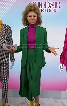 Ally Love on Today on NBC was spotted wearing this green blazer and pleated skirt on Today on Dec 11 2023's episode. Ally's Jacket is the Wool Blend Blazer by Zara . Ally's Skirt is the Belted Pleated Skirt by Zara.