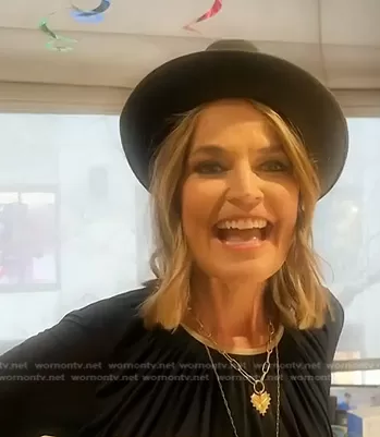 Savannah Guthrie on Today on NBC was spotted wearing this black gathered neck top on Today on Dec 11 2023's episode. Savannah's Bodysuit is the Poulson Gathered Stretch-Jersey Bodysuit by Goldsign.