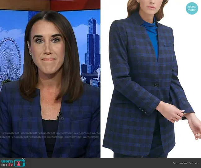on NBC News Daily on NBC was spotted wearing this blue checked blazer on NBC News Daily on Sep 16 2024's episode. 's Jacket is the One-Button Plaid Blazer by DKNY.