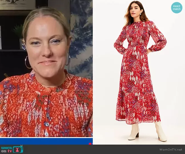 on NBC News Daily on NBC was spotted wearing this red printed smocked dress on NBC News Daily on Dec 10 2023's episode. 's Dress is the Garden Smocked Bodice Tiered Maxi Dress by Loft.