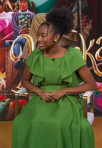 on Good Morning America on ABC was spotted wearing this green ruffle belted dress on Good Morning America on Dec 12 2023's episode. 's Dress is the Pre Fall 2023 Collection by Adeam.
