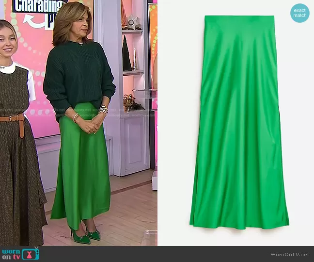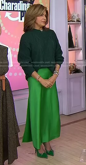 Hoda Kotb on Today on NBC was spotted wearing this green cable knit sweater and satin slit skirt on Today on Dec 12 2023's episode. Hoda's Sweater is the Cable Knit Sweater by Zaful at Amazon . Hoda's Skirt is the Gwyneth Long Slip Skirt in Vintage Kelly by J. Crew . Hoda's Shoes is the Beaded Pumps Slingback in Green by Aumoted at Amazon.