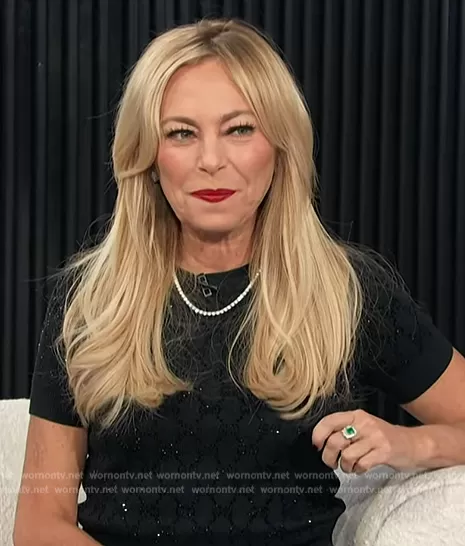 on E! News on E! was spotted wearing this black GG embellished short sleeve sweater on E! News on Dec 12 2023's episode. 's Sweater is the GG crystal-embellished wool sweater by Gucci.