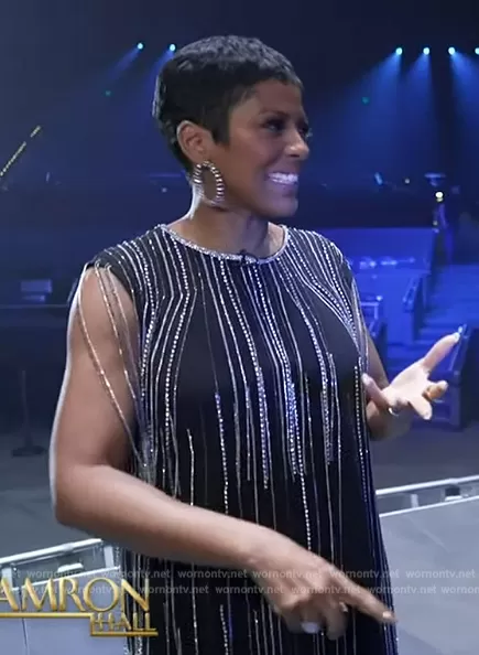 Tamron Hall on Tamron Hall Show on ABC was spotted wearing this black crystal embellished mini dress on Tamron Hall Show on Jan 16 2024's episode. Tamron's Dress is the Ilia Diamante Dress by All Saints.