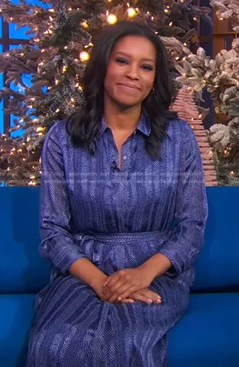 Rachel Scott on Good Morning America on ABC was spotted wearing this blue herringbone shirtdress on Good Morning America on Dec 13 2023's episode. Rachel's Dress is the Herringbone Maxi Shirt Dress by Banana Republic.