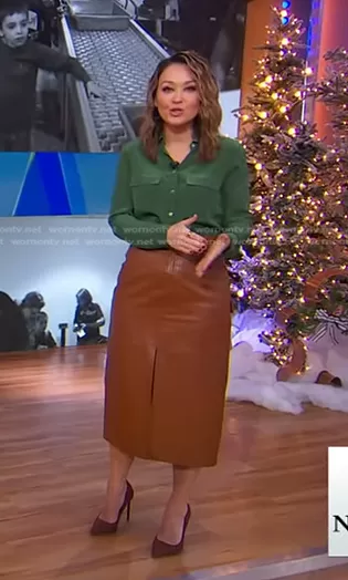 Eva Pilgrim on Good Morning America on ABC was spotted wearing this green shirt and brown leather skirt on Good Morning America on Dec 13 2023's episode. Eva's Top is the Signature Silk Shirt in Army Green by Equipment . Eva's Skirt is the Alden Skirt by A.L.C..