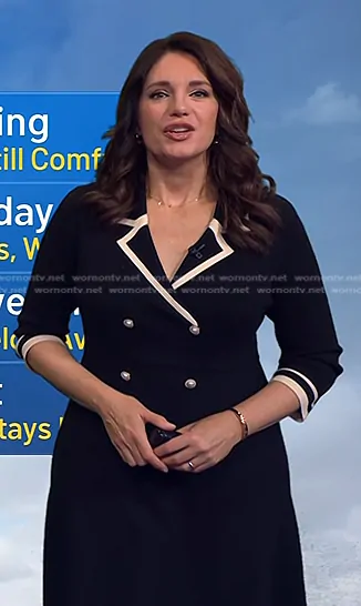 Maria Larosa on Today on NBC was spotted wearing this black contrast trim blazer dress on Today on Sep 13 2025's episode. Maria L's Blazer is the Fitted Double-Breasted V-Neck Mini Dress by Goelia.