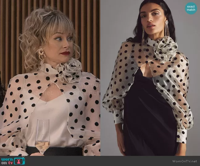 Maisy (played by Alyshia Ochse) on The Other Black Girl on Hulu was spotted wearing this polka dot overlay blouse on The Other Black Girl on episode 'Down with Disease' (1x10) in Dec 2023. Maisy's Top is the Rosette Tullle Sleeves by By Anthropologie.