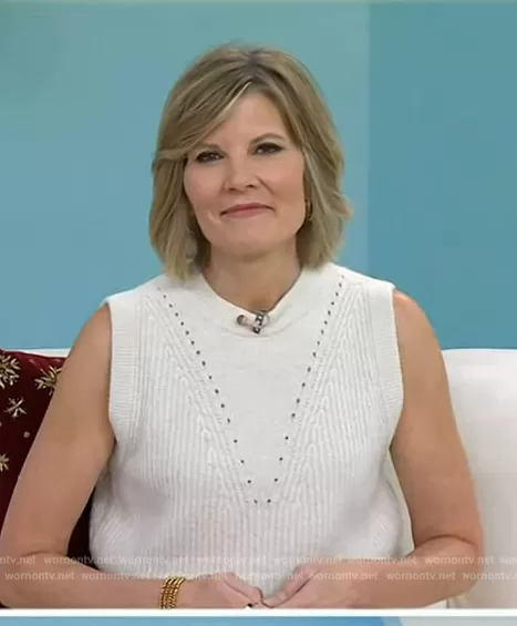 on Today on NBC was spotted wearing this Kate Snows white knit sleeveless sweater on Today on Dec 14 2023's episode. 's Sweater is the White Fuzzy Slip Over by Scotch and Soda.