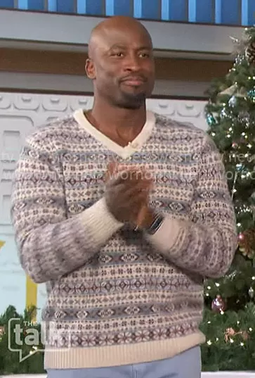 Akbar Gbajabiamila on The Talk on CBS was spotted wearing this blue fair isle sweater on The Talk on Dec 14 2023's episode. Akbar's Sweater is the Paul Fair Isle Brushed Wool Sweater by J. Crew . Akbar's Shoes is the Air Jordan 1 Retro High OG in University Blue by Nike.