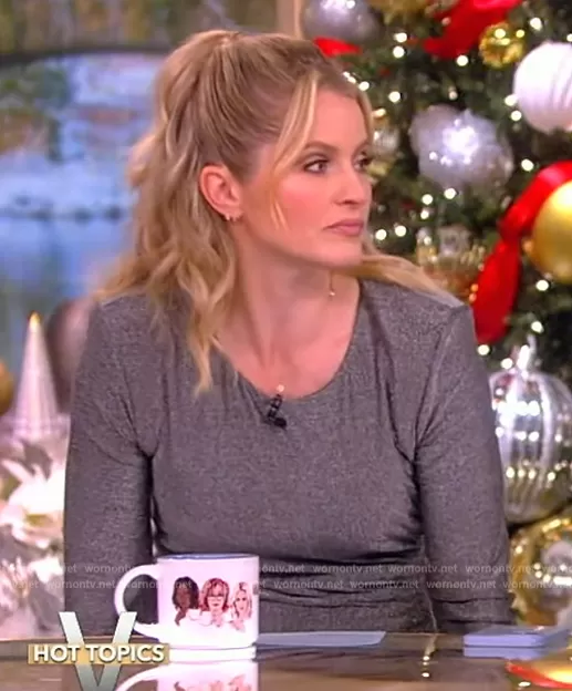 Sara Haines on The View on ABC was spotted wearing this silver metallic ruched dress on The View on Dec 13 2023's episode. Sara's Dress is the Cyrus Shimmer Ruched Minidress by Veronica Beard.