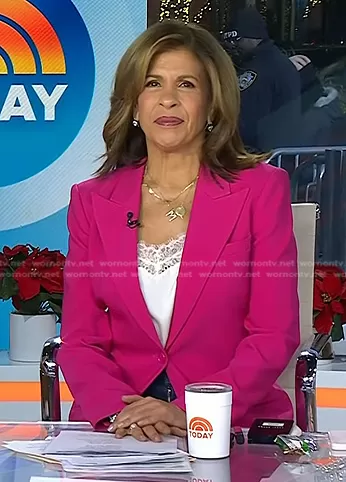 Hoda Kotb on Today on NBC was spotted wearing this fuchsia blazer on Today on Dec 14 2023's episode. Hoda's Jacket is the Georgina One-Button Wool Blazer in Fuchsia by Michael Kors.