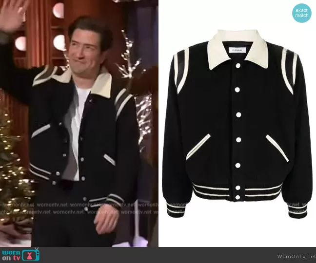 on The Kelly Clarkson Show on NBC was spotted wearing this black contrast trim bomber jacket on The Kelly Clarkson Show on Dec 15 2023's episode. 's Jacket is the Teddy wool-blend jacket by Flaneur.