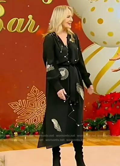 on Tamron Hall Show on ABC was spotted wearing this black printed midi dress on Tamron Hall Show on Dec 15 2023's episode. 's Dress is the Silk Long Dress by Figue.