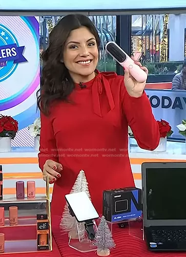 Adrianna Barrionuevo Brach on Today on NBC was spotted wearing this red tie neck dress on Today on Dec 15 2023's episode. Adrianna's Dress is the Tie-Neck Scuba Crepe Sheath Dress by Calvin Klein.