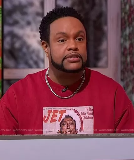 Jawn Murray on Sherri on FOX was spotted wearing this red Jet Christmas sweatshirt on Sherri on Dec 15 2023's episode. Jawn's Sweater is the Esther Rolle Black Santa Clause Sweatshirt by For The People.