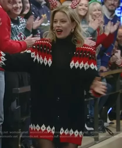 on Live with Kelly and Mark on Disney ABC Home Entertainment was spotted wearing this black fairisle cardigan on Live with Kelly and Mark on Dec 15 2023's episode. 's Sweater is the Parmida Knit Cardigan by Ronny Kobo.