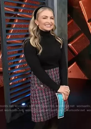 on Access Hollywood on NBC was spotted wearing this plaid tweed mini skirt on Access Hollywood on Dec 15 2023's episode. 's Skirt is the Loly Tweed Skirt by Sandro.