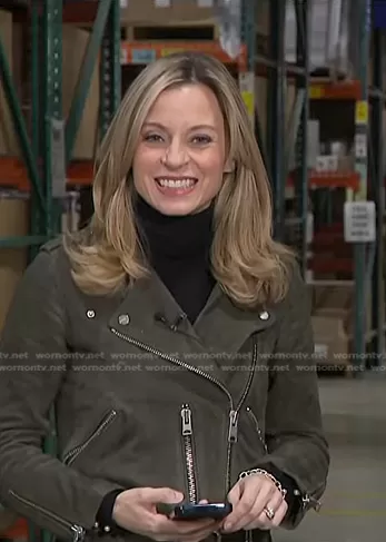 on NBC News Daily on NBC was spotted wearing this army green moto jacket on NBC News Daily on Dec 17 2023's episode. 's Jacket is the Balfern Leather Biker Jacket in Dark Army Green by All Saints.