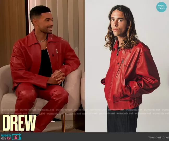 Drew Barrymore on The Drew Barrymore Show on CBS was spotted wearing this red leather jacket on The Drew Barrymore Show on Dec 16 2023's episode. Drew's Jacket is the Opium Den Frank Jacket by Maxfield LA.