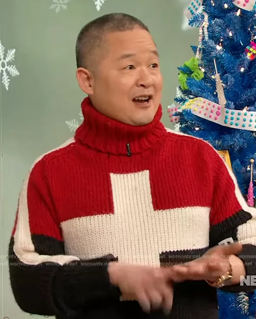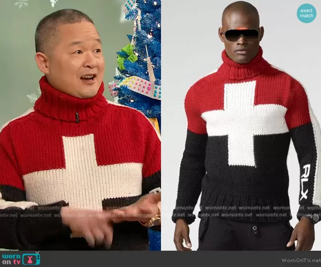 on The Drew Barrymore Show on CBS was spotted wearing this colorblock cross sweater on The Drew Barrymore Show on Dec 16 2023's episode. 's Sweater is the xRLX Swiss Cross Turtleneck by Ralph Lauren.