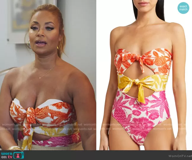 Gizelle Bryant on The Real Housewives of Potomac on Bravo was spotted wearing this floral print tie front swimsuit on The Real Housewives of Potomac on episode 'Painting Austin Red' (8x08) in Jan 2024. Gizelle's Swimsuit is the Tropical Woodcut Strapless Cutout One-Piece Swimsuit by Farm Rio . Gizelle's Pants is the Crochet flare pants in white by ASOS . Gizelle's Bag is the Paula's Ibiza Bag by Loewe.